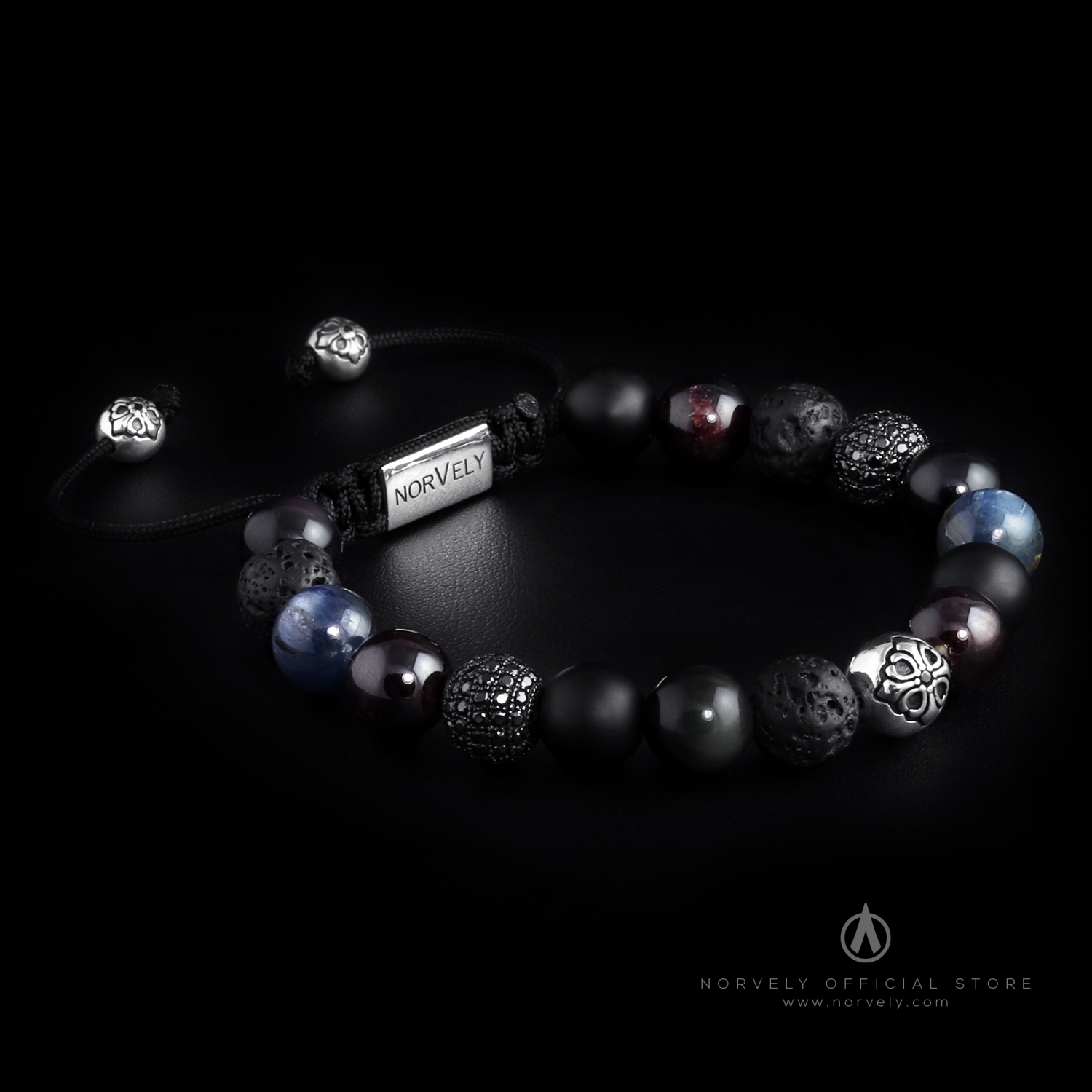 Norvely bracelet made of semi-precious stones and pure silver beads with a purity of 925/1000 with a lily embossed with black CZ diamond and Norvely logo and silver beads planted with black CZ diamonds and black plating. The bracelet includes obsidian, lava stone, kyanite, garnet and matte onyx. The bracelet is hand-knit from a strong 100% nylon cord with a wax for fiber protection and ended with a tightening knot, which makes it easy to select the level of tightening.