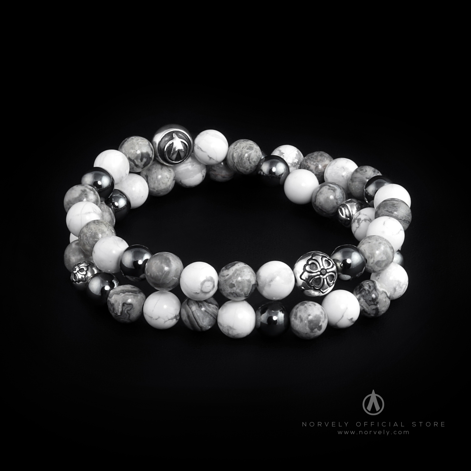 Norvely bracelet made of semi-precious stones and pure silver beads with a purity of 925/1000. The bracelet includes hematite, white howlite and grey jasper. Silver beads are lily embossed with black CZ diamond and Norvely logo. The components are threaded onto a strong elastic cord.